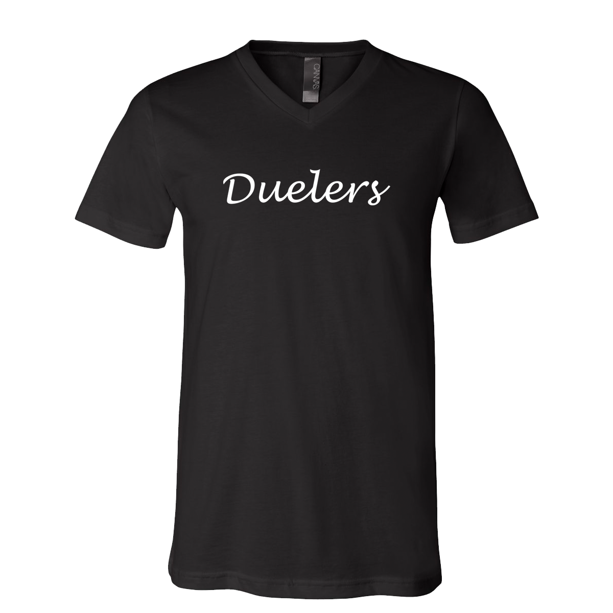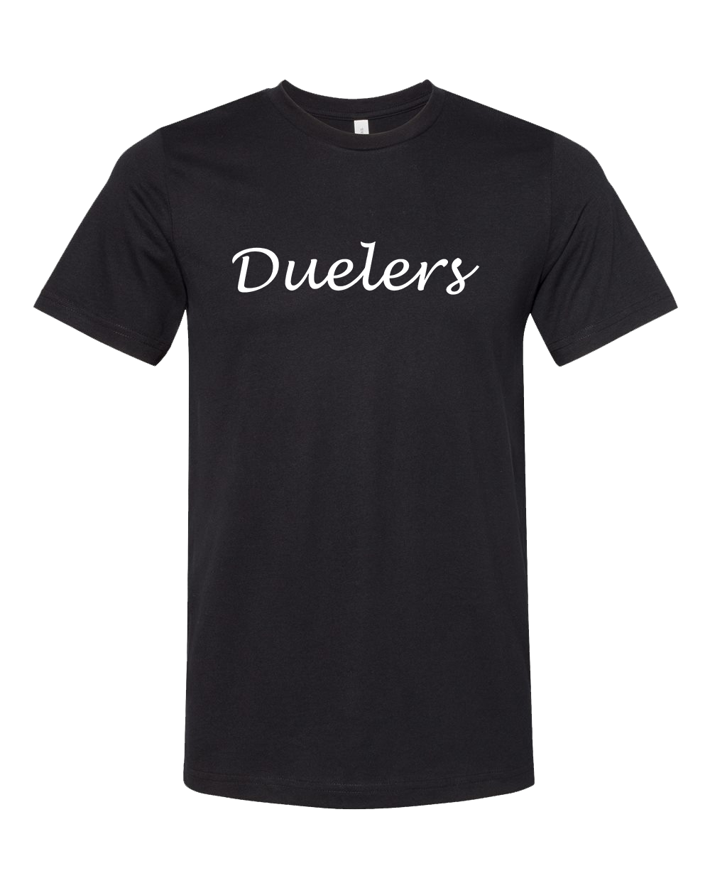 A printed Duelers Logo across the chest of a super soft unisex cut black crew neck or V-neck. 100% Cotton. (Brand: BELLA + CANVAS)