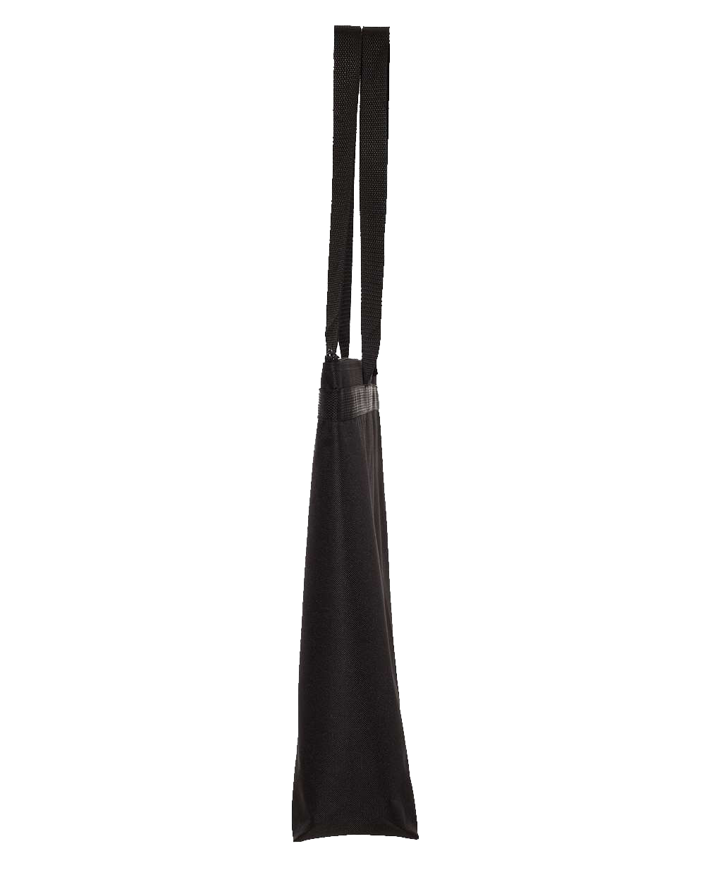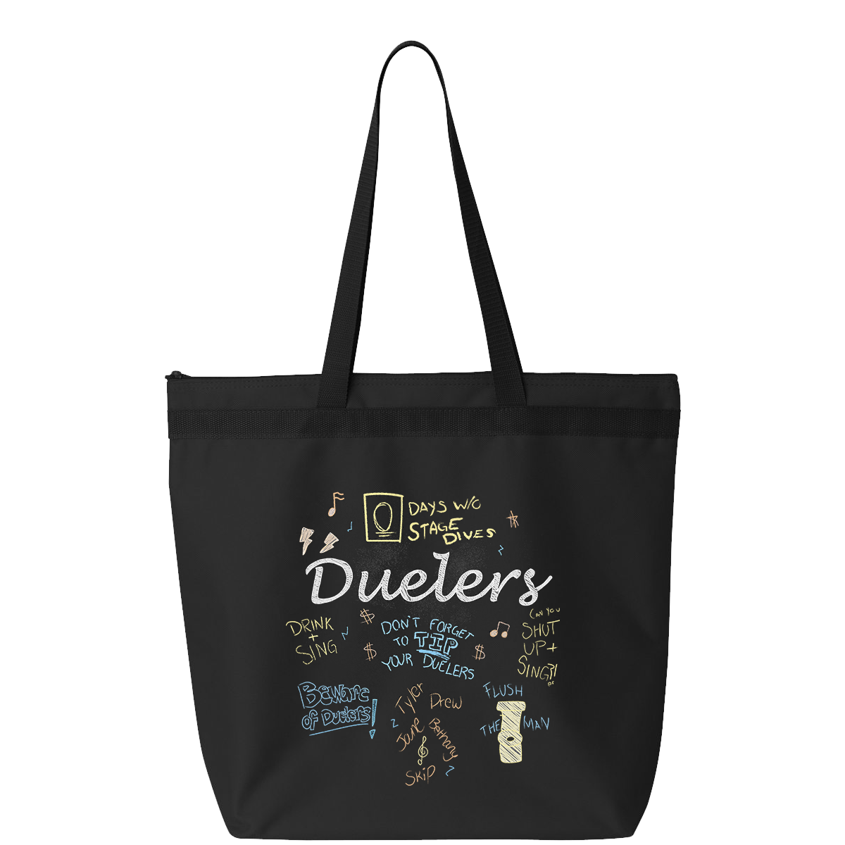 The chalkboard sketches printed on a zippered tote. 600D Polyester. Made with 50% recycled material. It's probably water resistant, we don't know, give it a shot! Dimensions are 18"W x 16"H x 4" 1/2"D with 28" handles.