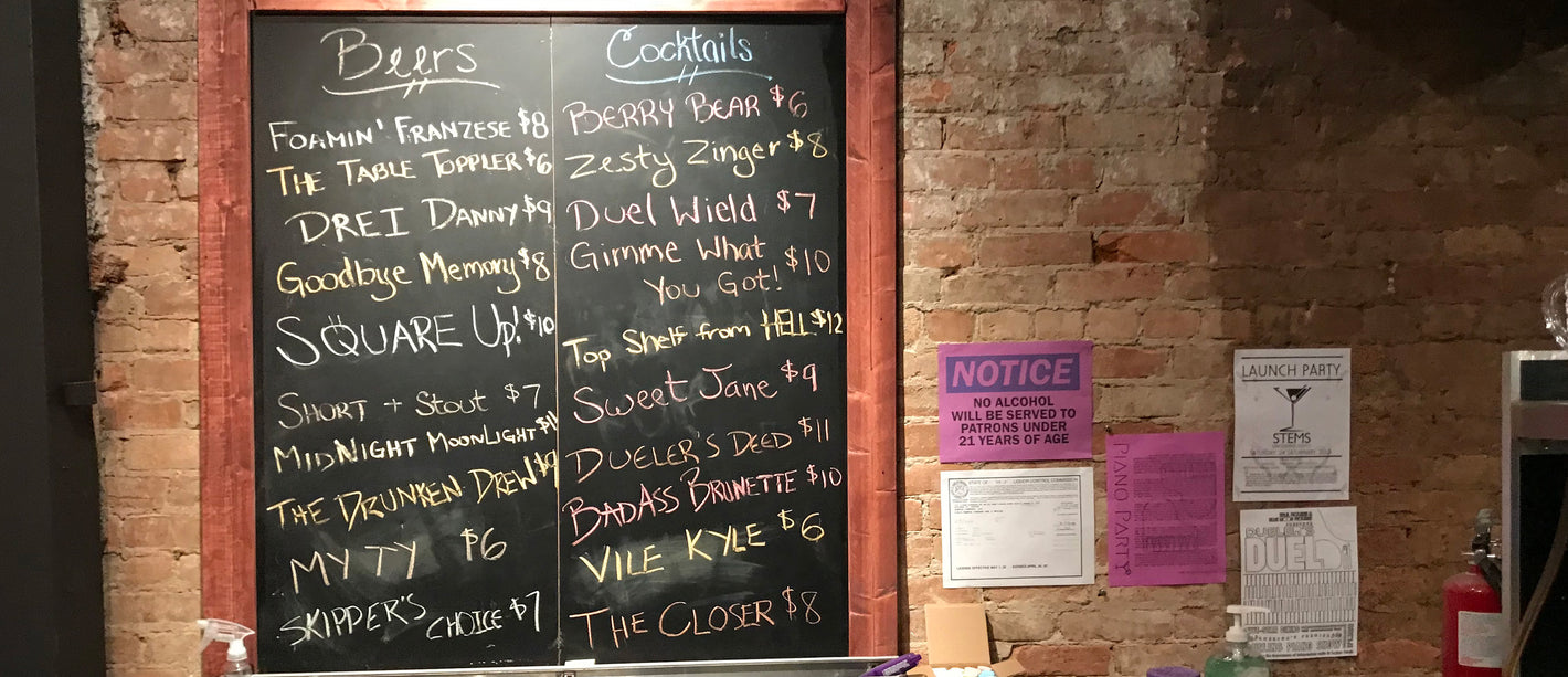 The Duelers bar logo was designed and carved into the wall above the bar by our crazy talented Production Designer, Joey Ostrander. All of the chalkboard doodles were scribbled by the cast, crew, and interns during the production of Duelers. Thank you Ann Arbor T-shirt Company for bringing this design to life!