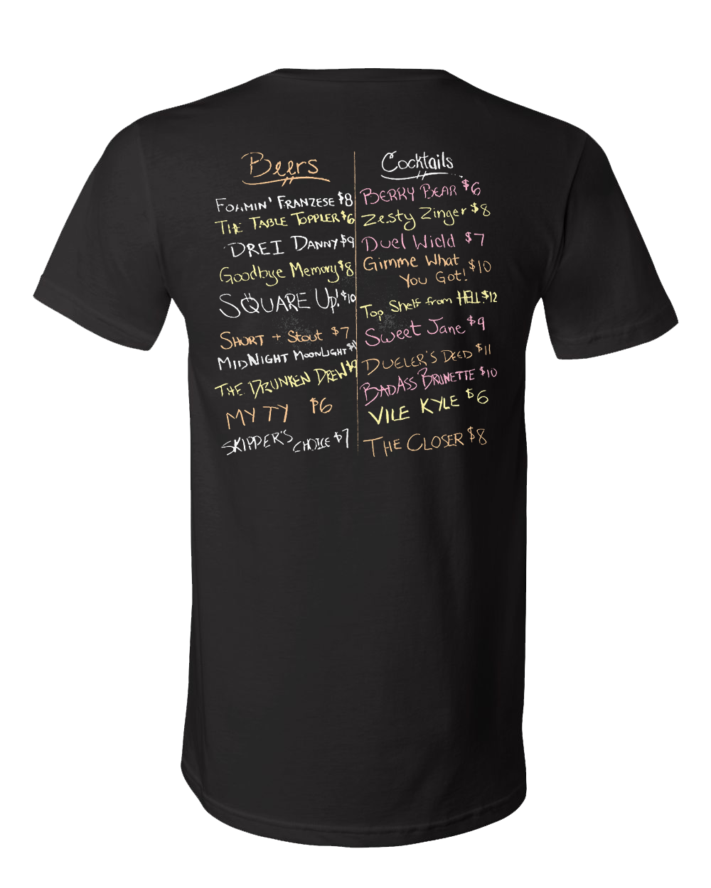 The Duelers stage chalkboard graffiti is featured on the front of a black unisex cotton shirt, with the Duelers bar menu on the back. (Brand: BELLA + CANVAS)